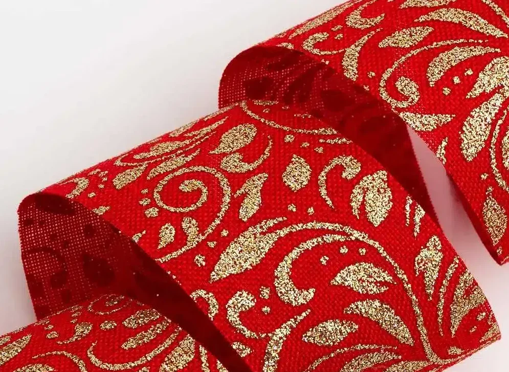 Gold Lurex Leaf Scroll Hessian Ribbon – Red 38mm