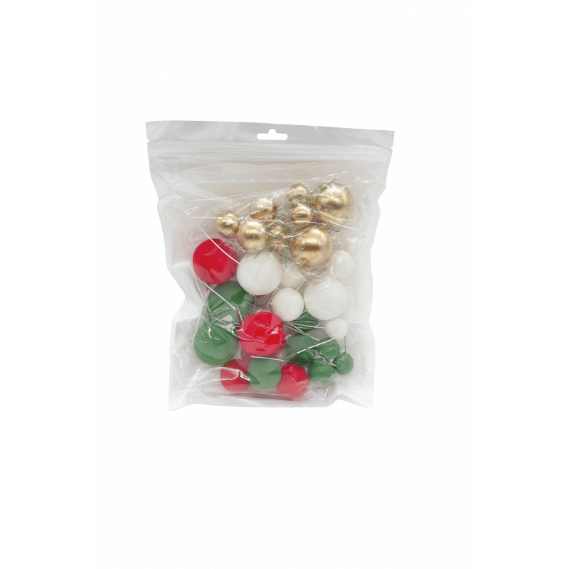 -8 balls of 3 cm. (2 red, 2 green, 2 white, and 2 gold).